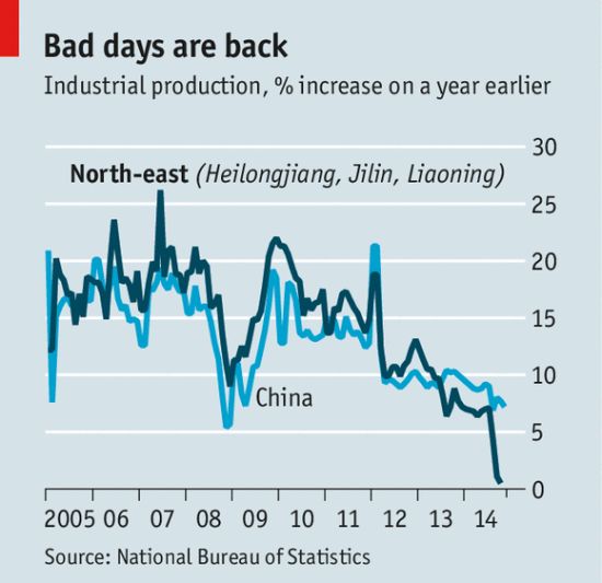 东北三省黑龙江、吉林和辽宁2014年前三个季度GDP增速在中国31省市中位居最后五位,其6%的增速较全国水平落后1.4个百分点。更糟的是,10月东三省工业产出同比仅增长0.5%,远低于全国7.7%的平均水平。