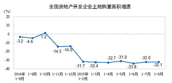 1-8月份,房地产开发企业土地购置面积14116万平方米,同比下降32.1%,降幅比1-7月份扩大0.1个百分点;土地成交价款4294亿元,下降24.6%,降幅收窄1个百分点。