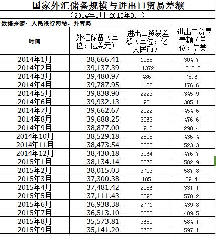 我做了一个表格,是从2014年1月至2015年9月的国家外汇储备和净出口差额的数据表。
