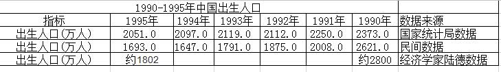 2、出生人口:1990年当年出生的孩子2800万,1995年当年出生的孩子1802万,5年之中少了1000万人口;(既然是引用陆德的论点就引用经济学家陆德的人口数据,经济学家的人口数据可能是从其他地方来的,我们不讨论)