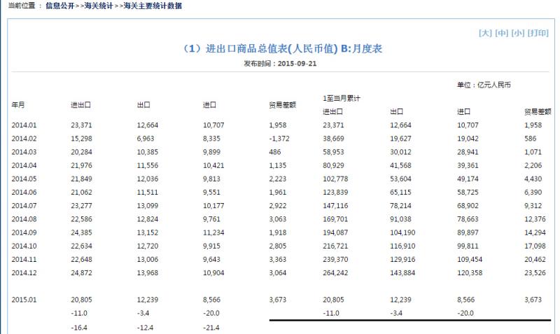 引用中国海关总署的2014年至2015年8月的数据: